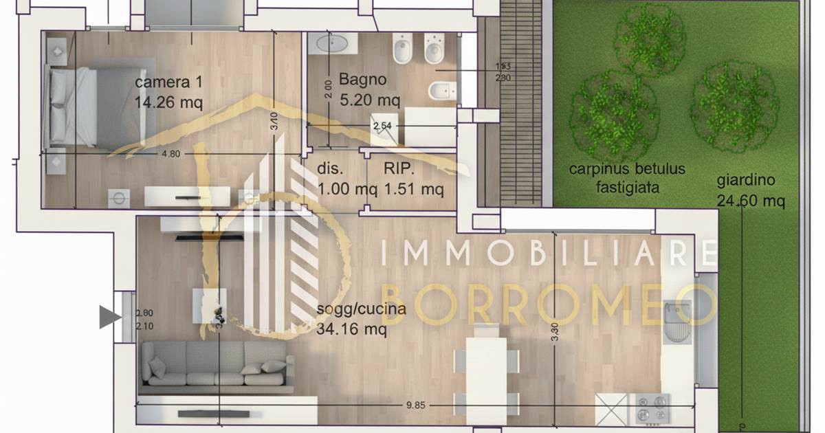 Proponiamo un elegante bilocale di 57 mq, situato al piano terra e impreziosito da un giardino privato di 25 mq, ideale per momenti di relax all’aperto.