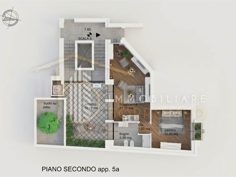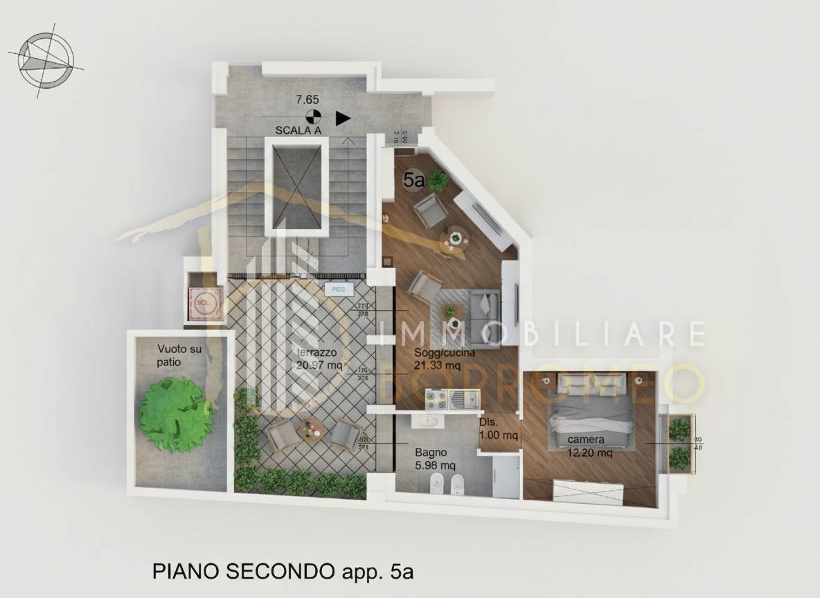 L’appartamento si apre sulla zona giorno con angolo cottura e accesso diretto all'ampio terrazzo. Il disimpegno introduce la zona notte, composta da una camera da letto e dal bagno.